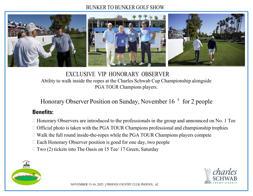Super User 2025 Charles Schwab Cup Championship "Walk with the Pros" Contest Name * Email Address * Phone * Are you a Bunker to Bunker Club Member? * Yes No Third Choice Are you interested in additional info on the Bunker to Bunker Club? * Yes No Third Choice Would you like to be added to the Bunker Golf email list? Yes No I'm already on it Submit
